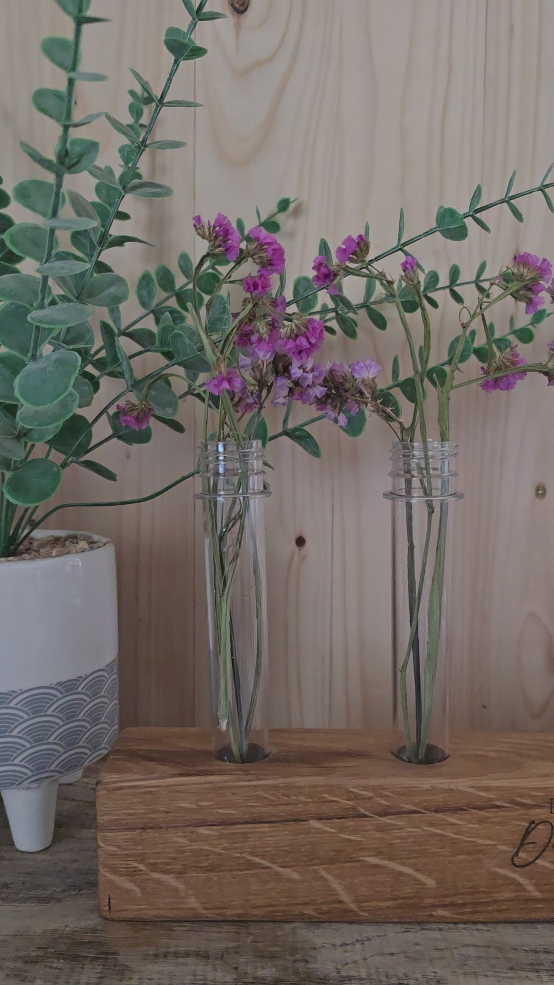 Blumenständer „Dankeschön, für all die großen und kleinen Dinge“ – Holzblock mit Reagenzgläsern