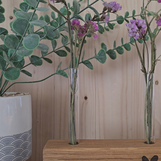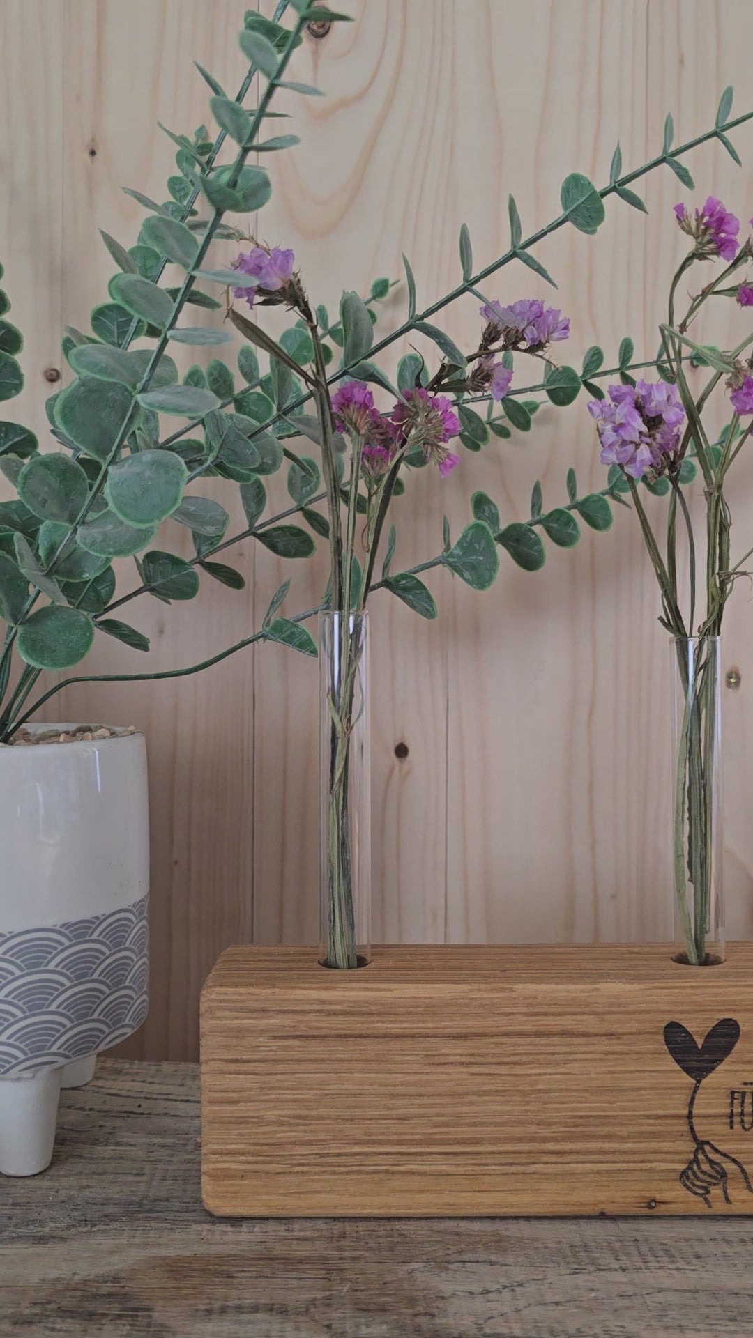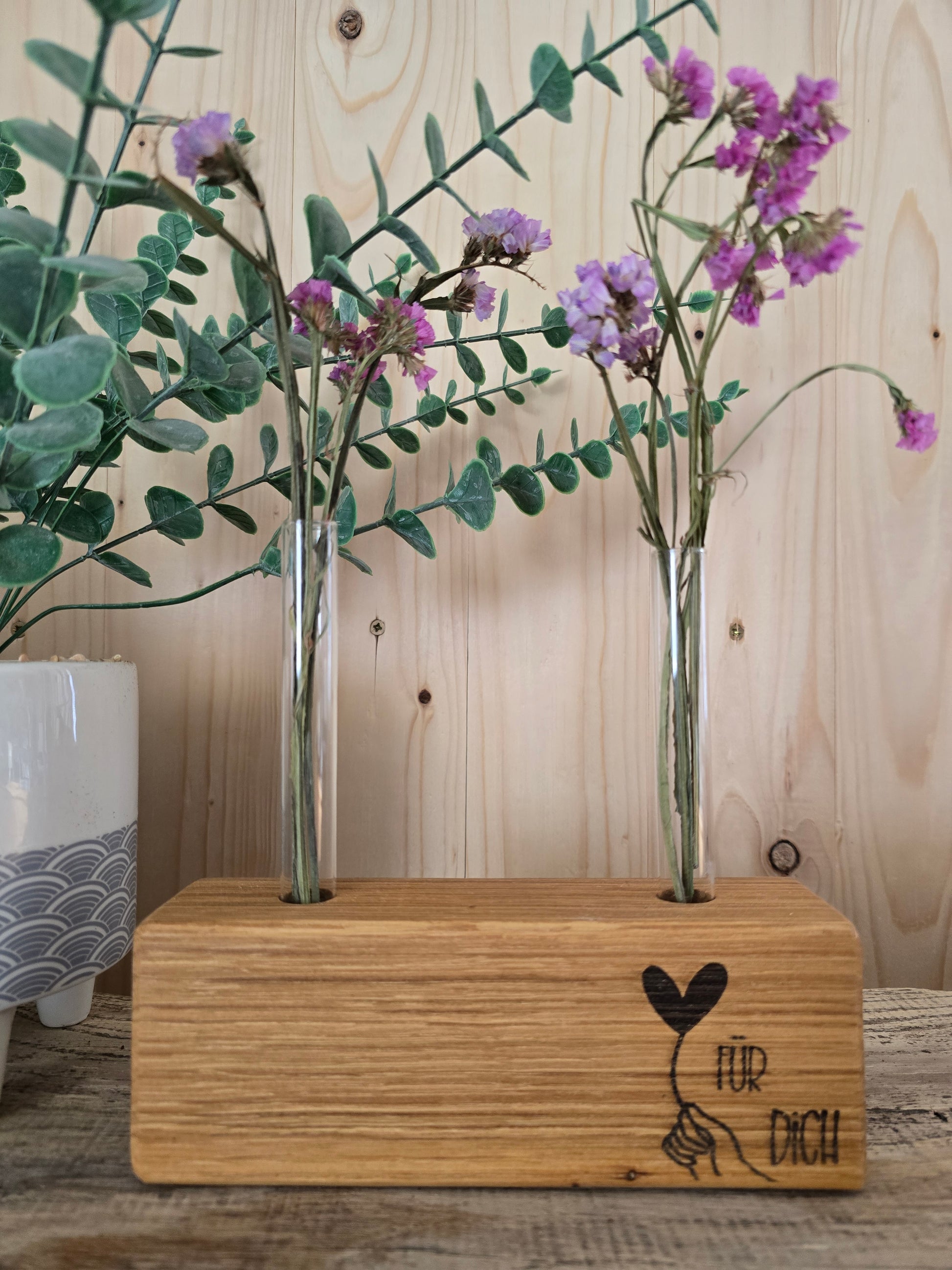 Blumenständer „Für Dich" – Holzblock mit Reagenzgläsern