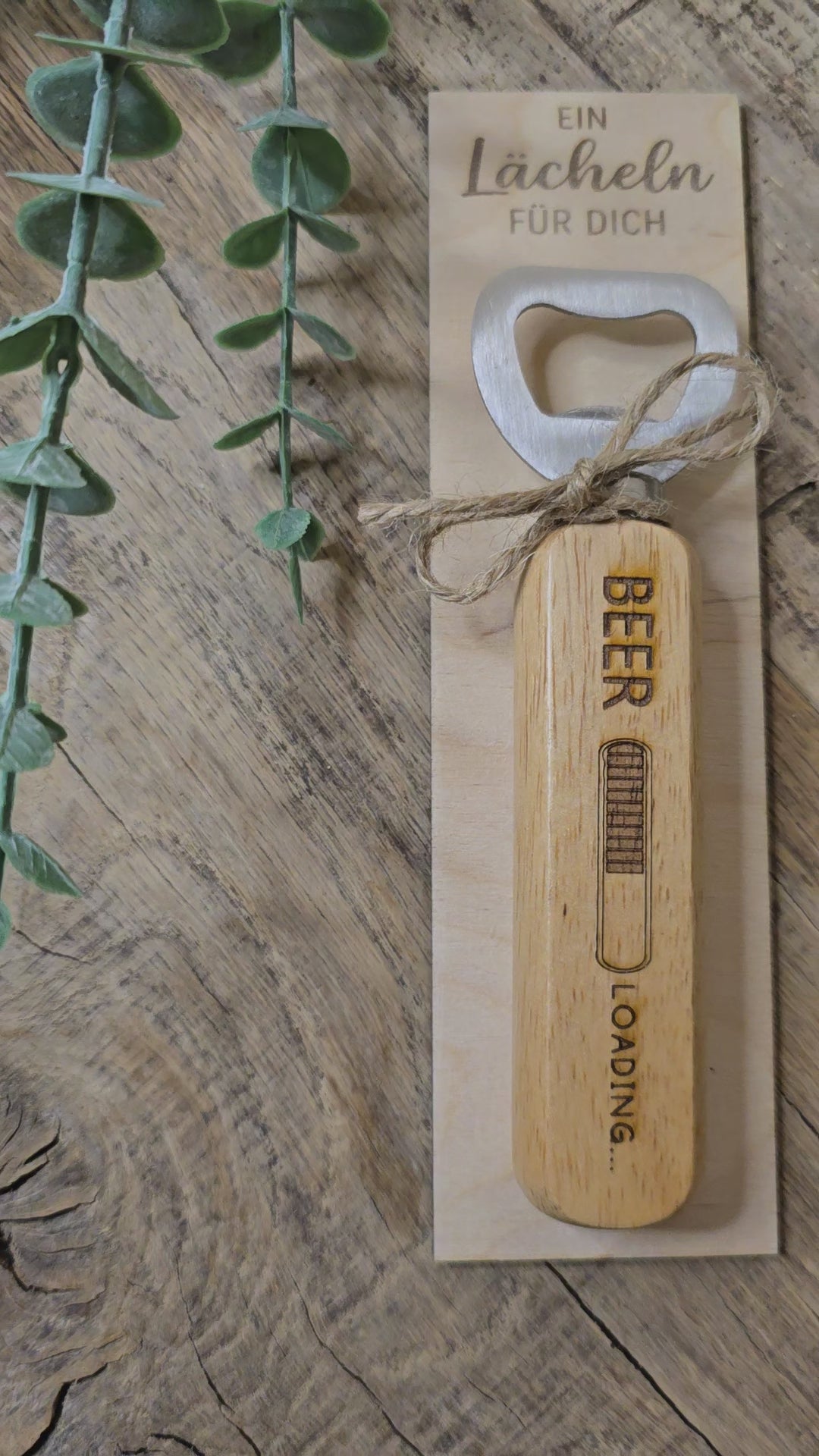 Der Bieröffner wird dekorativ auf einer hochwertigen Holzplatte befestigt, die mit dem Spruch „Ein Lächeln für dich“ graviert ist. Die rustikale Juteschleife rundet das Design ab und macht das Set sofort bereit zum Verschenken – ohne zusätzliche Verpackung.