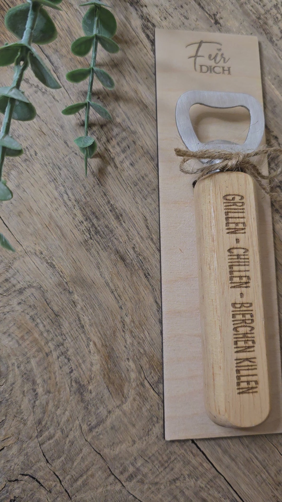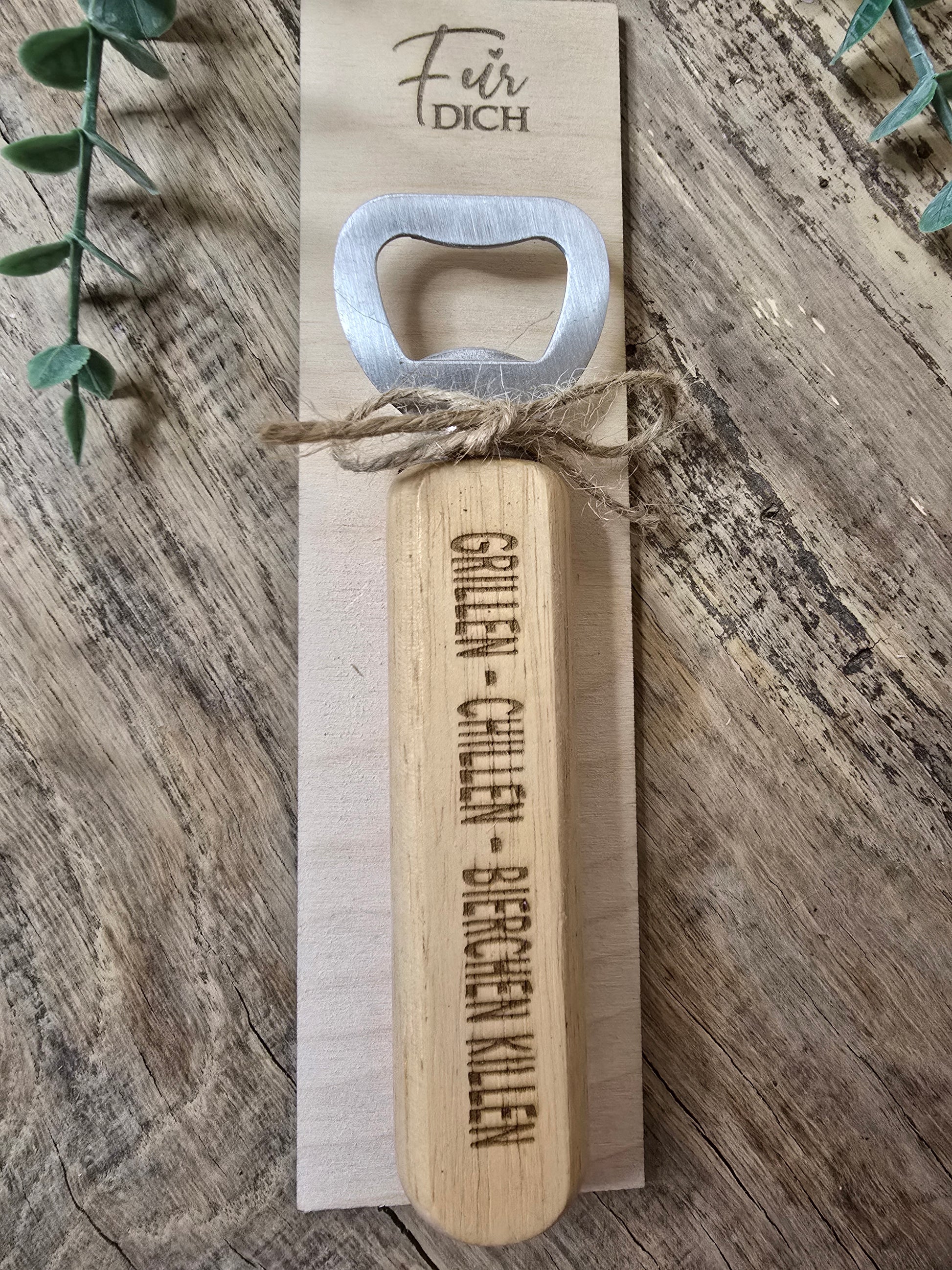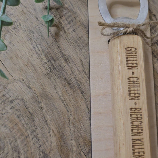 Dieser humorvolle Bieröffner ist das ideale Geschenk für alle, die den Sommer lieben: Grillen, entspannen und ein kühles Bier genießen – mehr braucht es manchmal nicht. Der hochwertige Holzgriff trägt die witzige Gravur „GRILLEN · CHILLEN · BIERCHEN KILLEN“ und sorgt direkt für gute Laune.