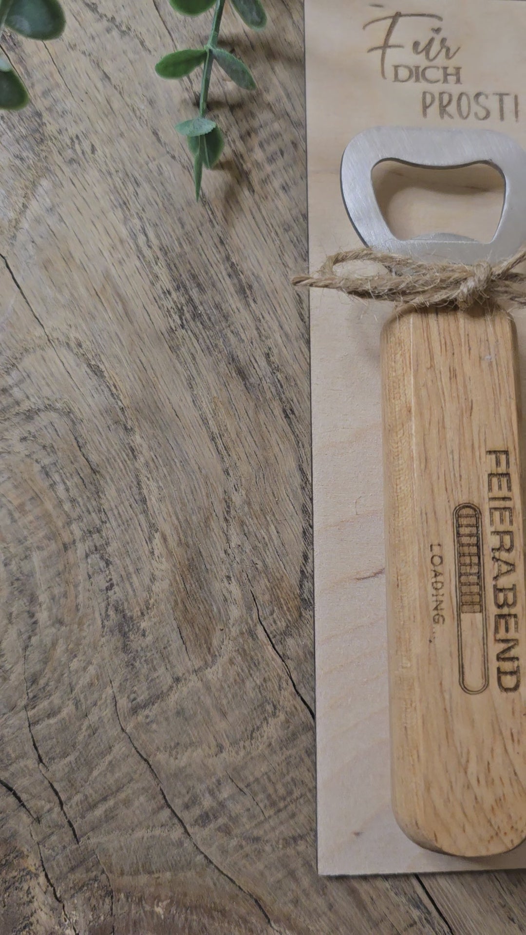 Dieser liebevoll gravierte Bieröffner ist das ideale Geschenk für alle, die den Feierabend zelebrieren – ob Partner, Freund, Kollege oder Familienmitglied. Der stabile Holzgriff trägt die humorvolle Gravur „FEIERABEND LOADING“ mit Ladebalken und sorgt garantiert für ein Lächeln beim ersten Öffnen des kühlen Biers.