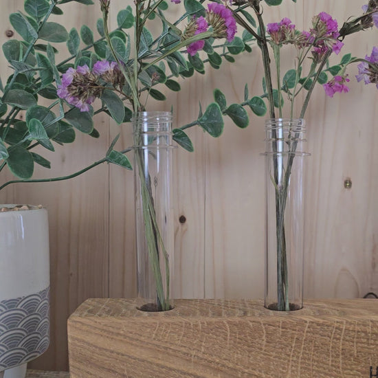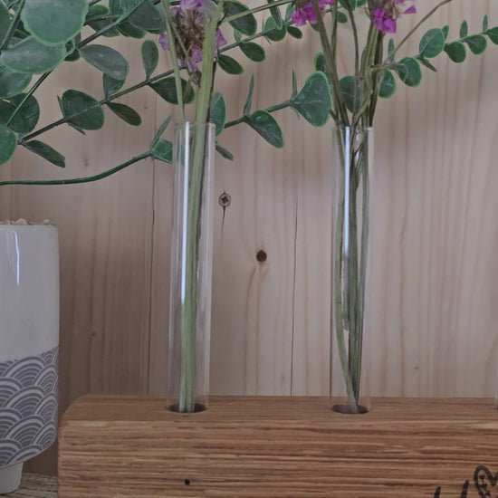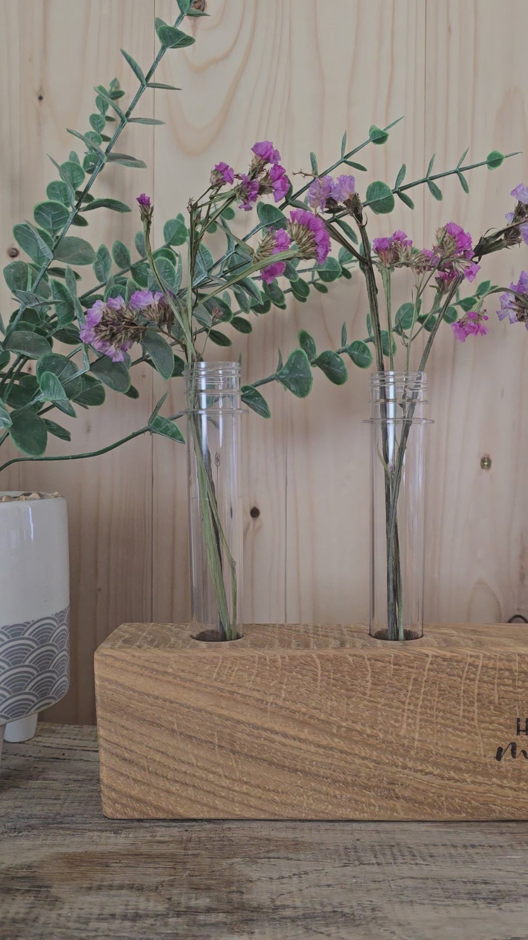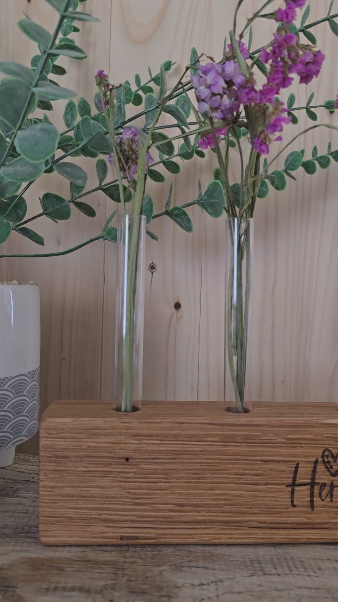Blumenständer „von Herzen“ oder „Herzensmensch“ – Holzblock mit Reagenzgläsern