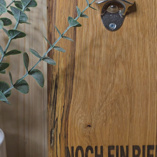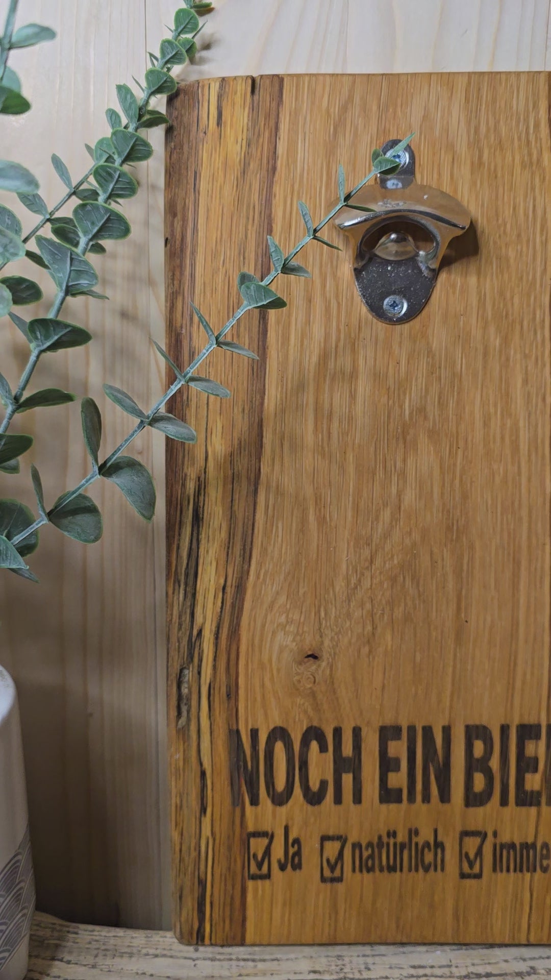 Noch ein Bier – Wand-Flaschenöffner aus Holz mit Gravur